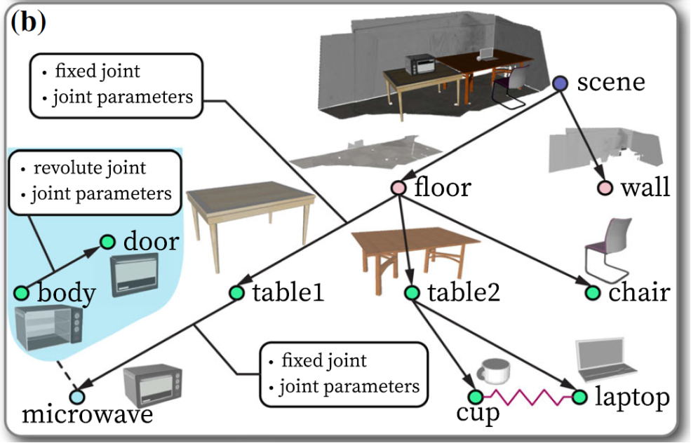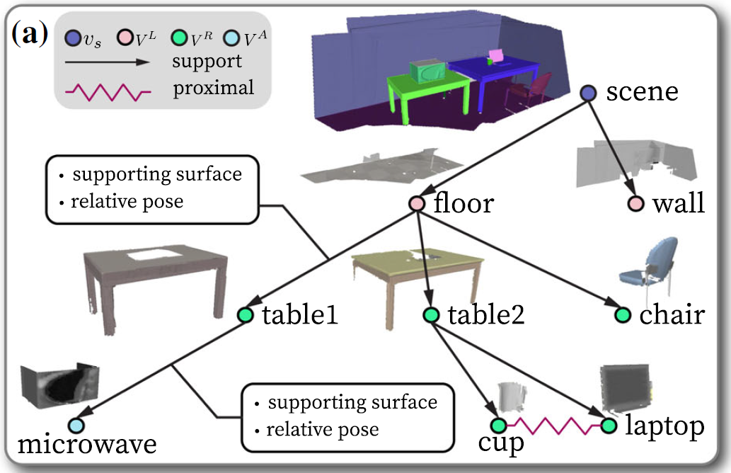 在这篇论文[1]中,研究人员提出了一个全新的研究问题:重建与现实场景功能相同的(functionally-equivalent)、可交互的(interactive)虚拟场景,以保留原场景的潜在动作信息。重建后的虚拟场景可以被用于机器人自主规划的仿真训练与测试。为实现这一重建任务,研究人员提出了一种基于物理支撑(supporting relation)与紧邻(proximal relation)关系的场景图表征,如图2(a);它的每个节点代表场景中的一个物体或者一种房间结构(墙/地面/房顶)。这一场景图表征将重建后的场景以及其中包含的物理约束有机组织起来,以保证得到的虚拟场景是符合物理常识的。同时,它可以直接被转换成环境的树状运动链(kinematic tree),完整地描述了环境的运动学关系状态,并支持前向预测机器人动作对环境的影响,可被直接用于机器人规划任务中。这篇论文也提出了一个完整的机器视觉系统来实现这一重建任务,并为重建后的场景设计了输出接口,使其能够被无缝接入机器人仿真器(例如Gazebo)和VR环境中。这一论文的部分前期工作[2]曾发表在ICRA 2021上。