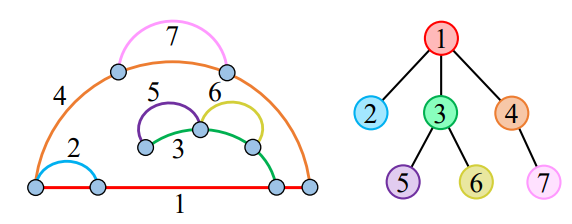 嵌套耳分解示意图以及不同耳之间所诱导的关系树。